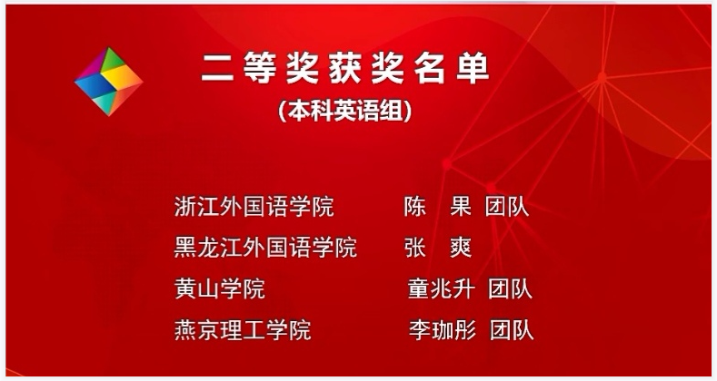 全国交流活动在线上进行,童兆升作为团队代表在七分钟内全英文介绍了该微课的选题背景、教学内容、教学目标、教学方法、教学步骤以及教学反思等。选手最终成绩由教学视频的评分和现场说课评分两部分构成,根据总成绩排名,童兆升团队最终获得全国本科英语组二等奖。